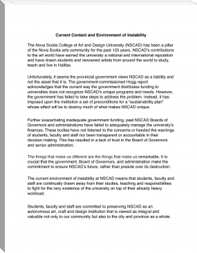NOVA SCOTIA ART AND DESIGN UNIVERSITY'S MANIFESTO. COLLECTIVELY WRITTEN BY STUDENTS, FACULTY AND STAFF - JANUARY 2013 The students, faculty and staff have come together to reaffirm what is essential to NSCAD University as an institution, a community, a work place, a place of learning and art making. This manifesto has been collectively produced by NSCAD students, faculty and staff and within it lies the values and qualities on which we are unwavering.